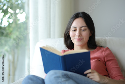 Fototapeta premium Satisfied asian woman reading a paper book at home