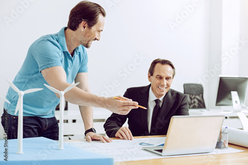 © Viacheslav Yakobchuk, Obraz premium Satisfied client. Happy friendly cheerful client getting his ready project while sitting in front of a laptop in a nice office