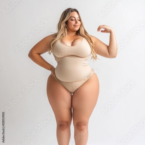 © GoodandEvil, Fototapeta premium Satisfied model in nude suit, arm raised happily