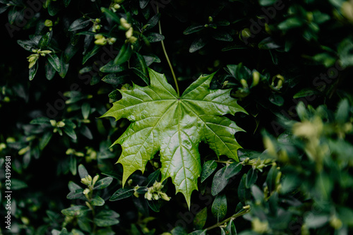 Fototapeta premium saturated green maple leaf on leaves on green background