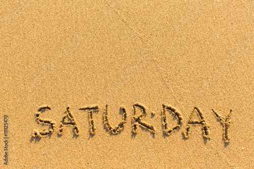 © De Visu, Fototapeta premium Saturday - inscription by hand on a light-golden beach sand.
