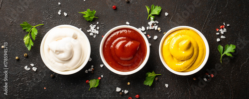 © nadianb, Fototapeta premium Sauce bowls - mayonnaise, mustard, ketchup on black background.