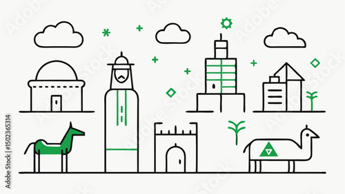 © SMUX SAFALI, Obraz premium saudi arabia line icons featuring famous buildings and structures throughout Saudi Arabia