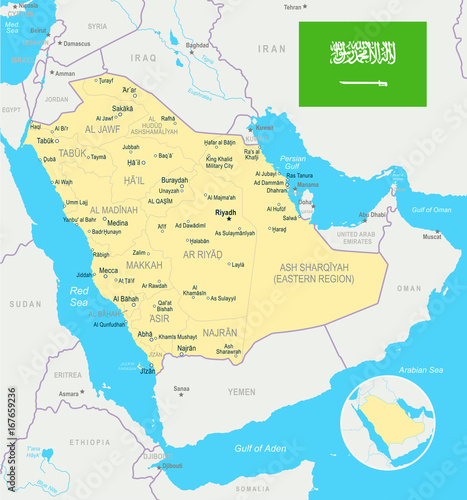 © Porcupen, Obraz premium Saudi Arabia - map and flag illustration
