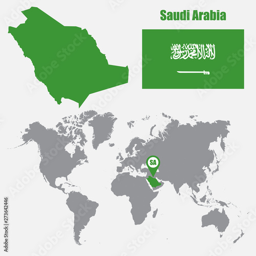 © stas111, Obraz premium Saudi Arabia map on a world map with flag and map pointer. Vector illustration