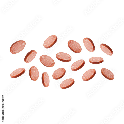 © Anastasiia Bublyk, Obraz premium Sausage pieces levitating, isolated on transparent PNG background