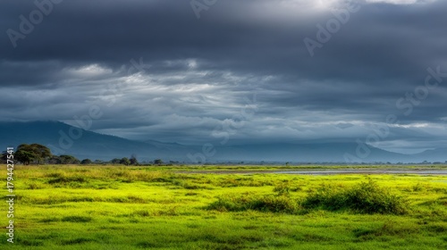 Obraz premium Savanna landscape with dark clouds, green grass, and wetlands, predicting a...