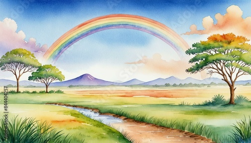 Obraz premium Savanna with a Rainbow After Rain and Vibrant Colors, Watercolor Background...