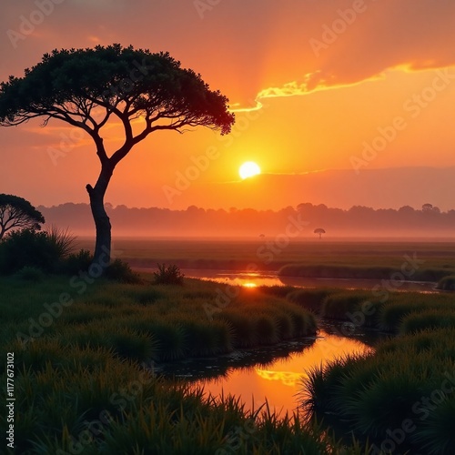 Obraz premium Savannah at dawn with sun rising over marshy landscape, golden hour, warm colors