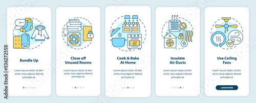 Fototapeta premium Save on heat energy bills in winter onboarding mobile app screen. Walkthrough 5 steps editable graphic instructions with linear concepts. UI, UX, GUI template. Myriad Pro-Bold, Regular fonts used