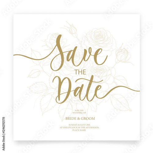 Naklejka premium Save the date card. Wedding invitation template, with flower of rose and leaves in line. Minimalism style with calligraphy.