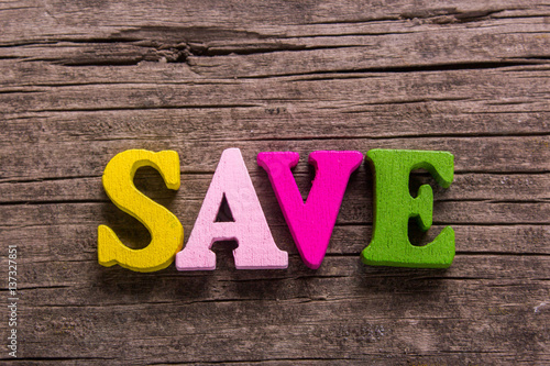 © adragan, Fototapeta premium save word made from colored wooden letters on an old table. Concept
