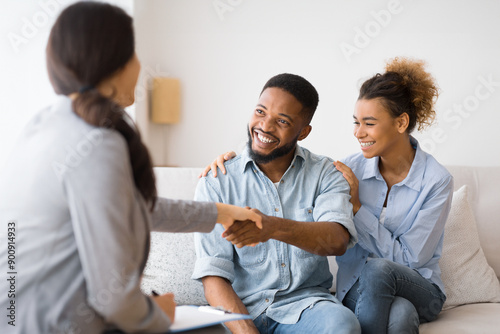 © Prostock-studio, Fototapeta premium Saved Marriage. Cheerful Young Afro Couple Handshaking With Marital Therapist After Session. Selective Focus