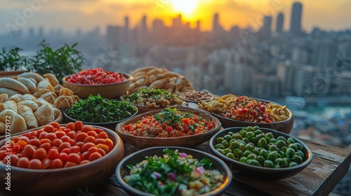 © Nakorn, Fototapeta premium Savor lebanese mezze platter against the stunning beirut skyline at sunset