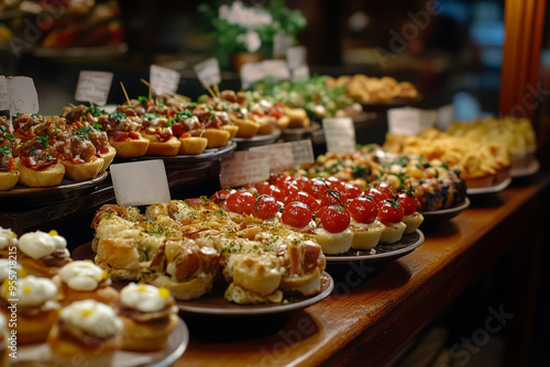 Fototapeta premium Savoring delectable tapas at a charming bar in San Sebastian during a lively...