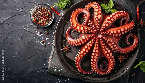 © Paulius, Fototapeta premium Savory Octopus Tentacles: A Spicy Herb Infusion on Metal Plate over Black Stone Background