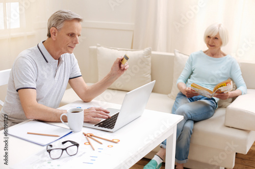 Obraz premium Savvy active aged man using internet banking