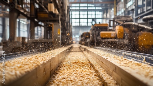 © utaem2022, Obraz premium Sawdust flying in woodworking factory processing lumber on conveyor belt