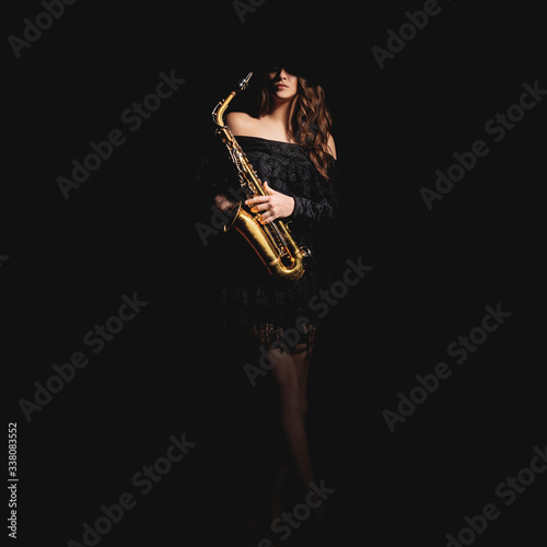 © Mironifamily, Obraz premium Saxophone player. Jazz musician saxophonist woman playing sax player isolated on black