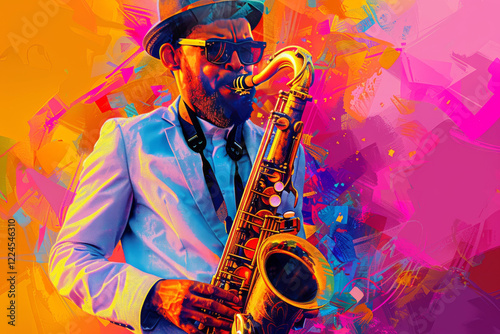 Fototapeta premium Saxophone Rhapsody: A vibrant and expressive portrait of a stylish musician...