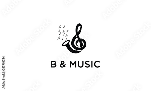Fototapeta premium Saxophones logo design template. Awesome a saxophones with music note & letter B logo. A saxophones with letter B & music note logotype.