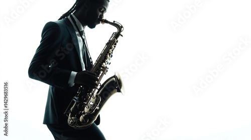 © Elang, Fototapeta premium Saxophonist in silhouette playing alto saxophone.