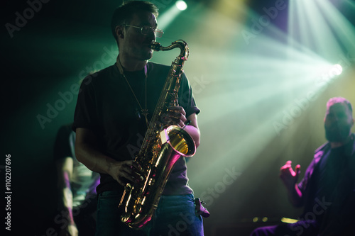 © Zamrznuti tonovi, Fototapeta premium Saxophonist performing live music on stage with band