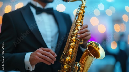 © oksa_studio, Fototapeta premium Saxophonist playing in chic lounge during new year's eve celebration