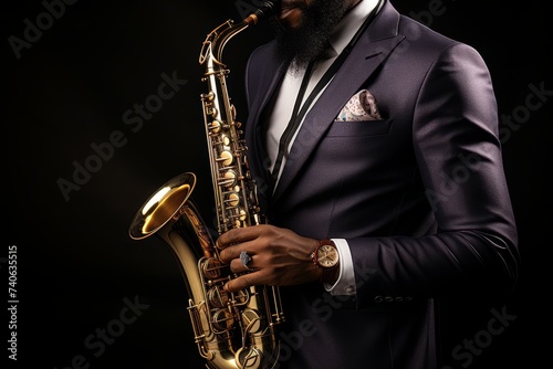 Fototapeta premium Saxophonists hands playing saxophone at jazz festival music background with copy space