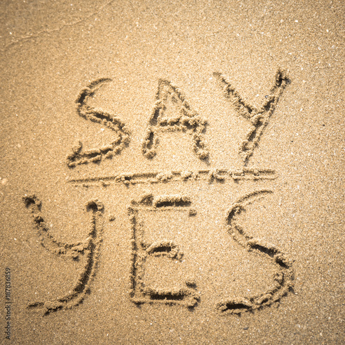 © anastasiapelikh, Fototapeta premium Say Yes word is written on the beach sand