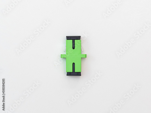 © bahadirbermekphoto, Obraz premium SC-UPC adapter for single mode fiber optic patch cord with flange on isolated white background