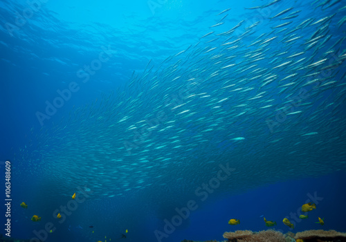 Fototapeta premium Scad jamb under water sea ecosystem, large school of fish on a blue...
