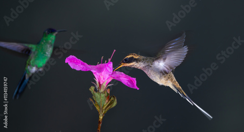 Fototapeta premium Scale-throated Hermit (Phaethornis eurynome) eating nectar from a purple...