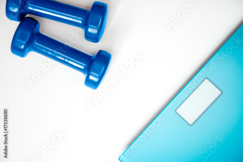 © solidmaks, Fototapeta premium scales and dumbbells on a white