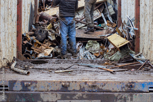 © Torkhov, Obraz premium scales with metal at the reception of recyclable materials for recycling and people helping to load them into a container