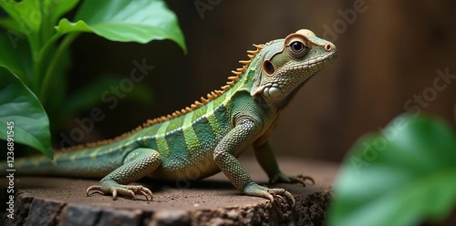© Sarayuth, Fototapeta premium Scaly lizard blends with rustic wooden background, natural textures, reptiles, leaves