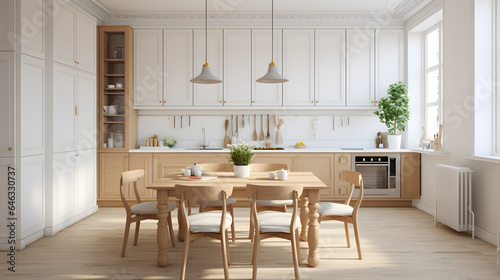 Fototapeta premium Scandinavian classic kitchen with white wooden work, minimalistic interior...