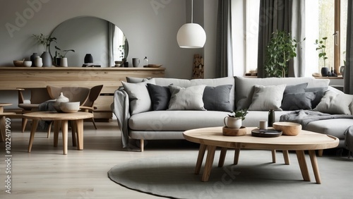 © Umri, Obraz premium Scandinavian home interior with a grey-pillow sofa and rustic round wood table, creating a warm, modern living room.-