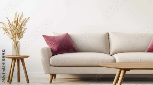 Fototapeta premium Scandinavian lounge, light beige sofa, raspberry pillow, tiny bouquet of dried grass on wood table, warm matte light