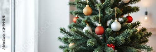 © DITSARAPHAN, Fototapeta premium Scandinavian style interior adorned with a 3D rendered New Year tree and festive Christmas decorations, greenery, Christmas decoration, interior design