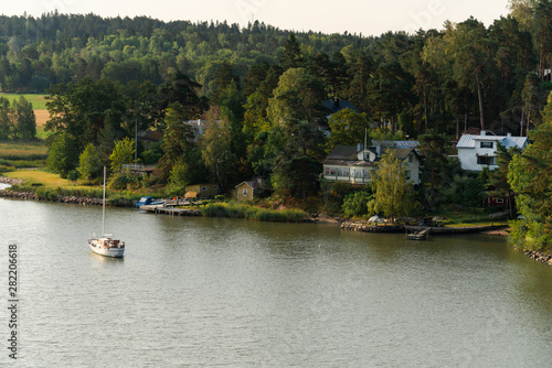 Naklejka premium Scandinavian village with traditional wooden houses on the coast of the Baltic sea