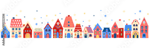 © svsunny, Naklejka premium Scandinavian Winter Village seamless border pattern, Cozy Folk Art Houses Illustration