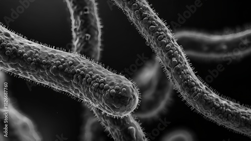Naklejka premium Scanning Electron Micrograph Style 3D Render of Piliated Bacteria