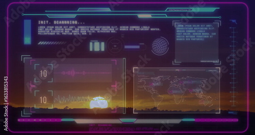 Obraz premium Scanning half-visible yellow sun on horizon at sunset with neon HUD...
