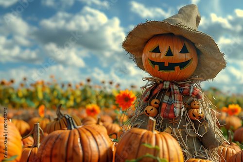 Naklejka premium Scarecrow standing in a pumpkin patch