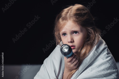 Fototapeta premium scared kid sitting under blanket and holding flashlight isolated on black