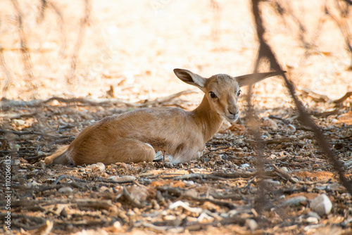 Fototapeta premium Scared springbok cub alone waits for mother to arrive