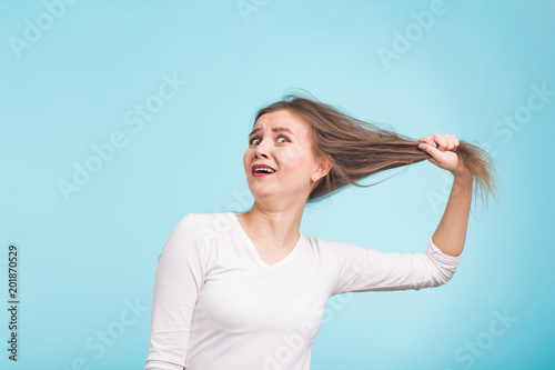 © satura_, Fototapeta premium Scared young woman with unhealthy long hair keep hair in hand with nature make up portrait isolated on blue