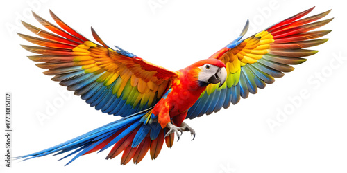 © najira21, Fototapeta premium Scarlet macaw flying isolated on transparent background with wings spread wide