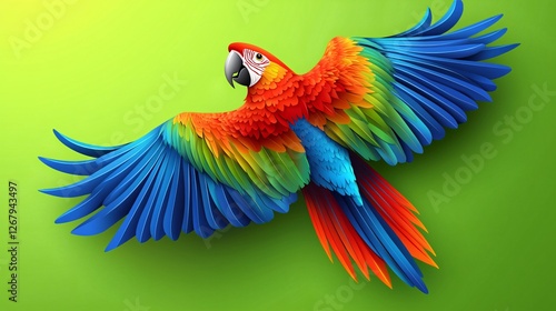 © TBC, Obraz premium Scarlet Macaw in flight, green background, vibrant plumage, tropical bird